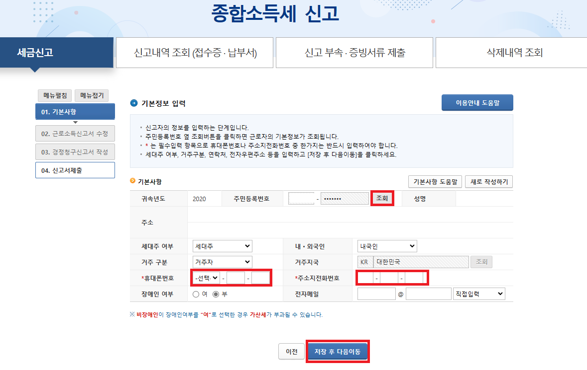 5) 먼저 조회를 누른 후 휴대폰번호, 전화번호를 입력 저장 후 다음으로 이동합니다.