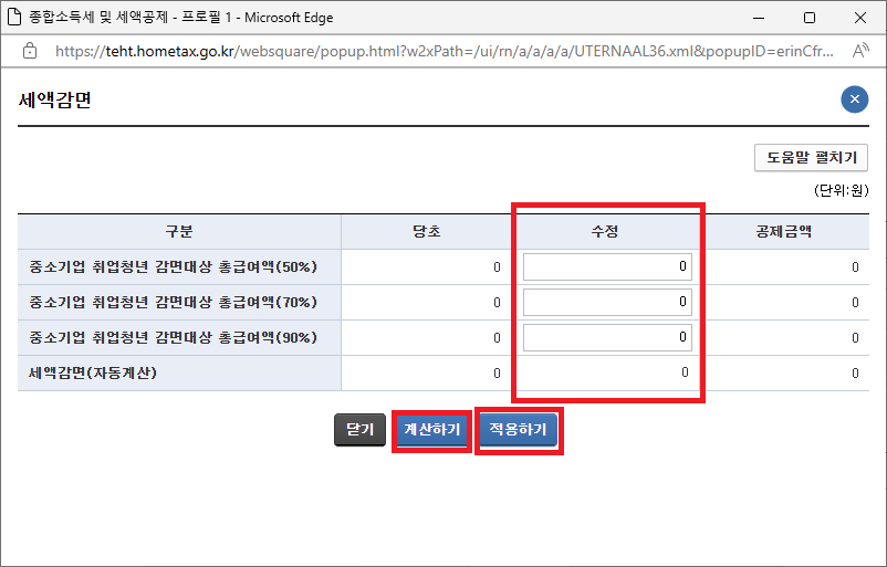 7) 해당하는 칸에 21번 총 급여를 입력 후 계산하기를 누르고 적용하기를 누릅니다.
